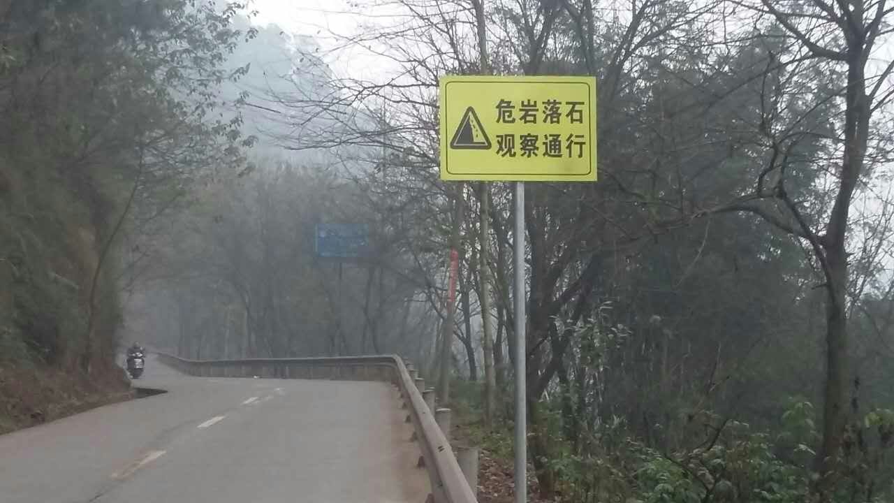 1月3日下午,记者来到事发现场,此时地面还可看到血迹,砸人的巨石还在现场,重约百斤。一旁山岩上建有一块文化墙,上方即是裸露的岩石。几米远外,一块“小心落石”的警示标牌,悬挂在道路上方。