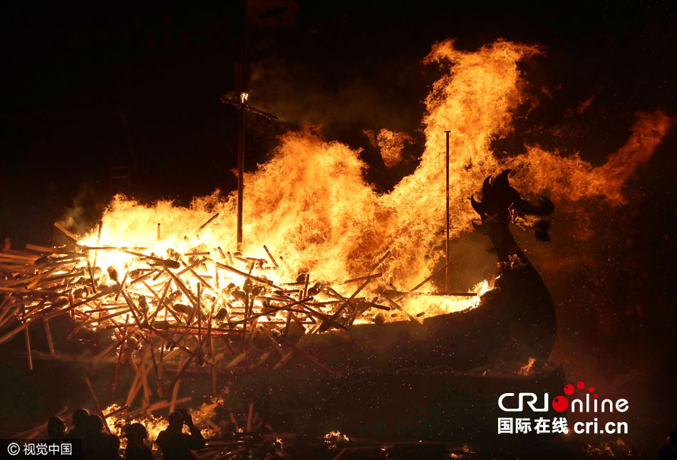 当地时间2017年1月31日,英国设得兰群岛,当地举办“维京海盗节”,人们身穿古代盔甲,手持兵器重现当年维京人在约克征战的情景。公元10世纪,从北欧乘船南下的维京人一度占领英国约克郡,并在当地建城定居。图片来源:视觉中国