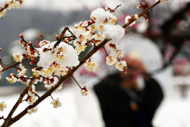 国际在线专稿:据日本《产经新闻》2月9日报道,受冷空气影响,日本关东部分地区9日早晨迎来降雪。水户市的积雪更是达到了12厘米,在该市的赏梅名胜偕乐园里,已经开了的粉色和白色梅花在雪中傲立,别有一番风味。