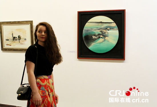 俄罗斯参观者在展出的作品前留影