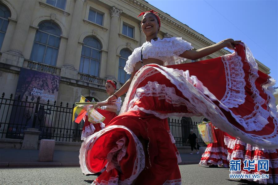 6月30日,在罗马尼亚首都布加勒斯特,哥伦比亚艺术家参加第11届国际民俗节。