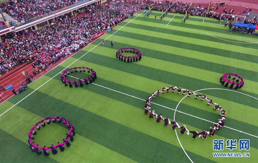 7月29日,来自四川省道孚县尼措片区的藏族群众在表演锅庄。当日,来自四川省道孚县各地的上万名藏族群众在道孚中学载歌载舞,欢庆第三届安巴农耕文化旅游节。安巴在藏语中是五月的意思,藏历五月正值农闲时期,藏族群众都会举行各种活动,祈祷风调雨顺,吉祥平安。新华社记者 薛玉斌 摄