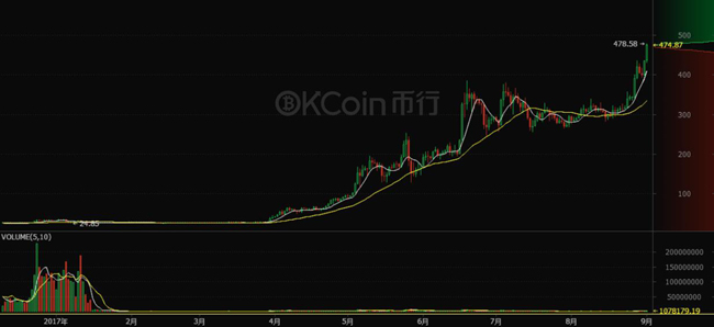 国际在线消息:据中国知名的数字资产交易平台OKCoin币行行情数据显示,9月1日莱特币价格再次突破新高478.58元。今年3月份,莱特币的最低价格为20元。如今,莱特币价格已翻23倍。