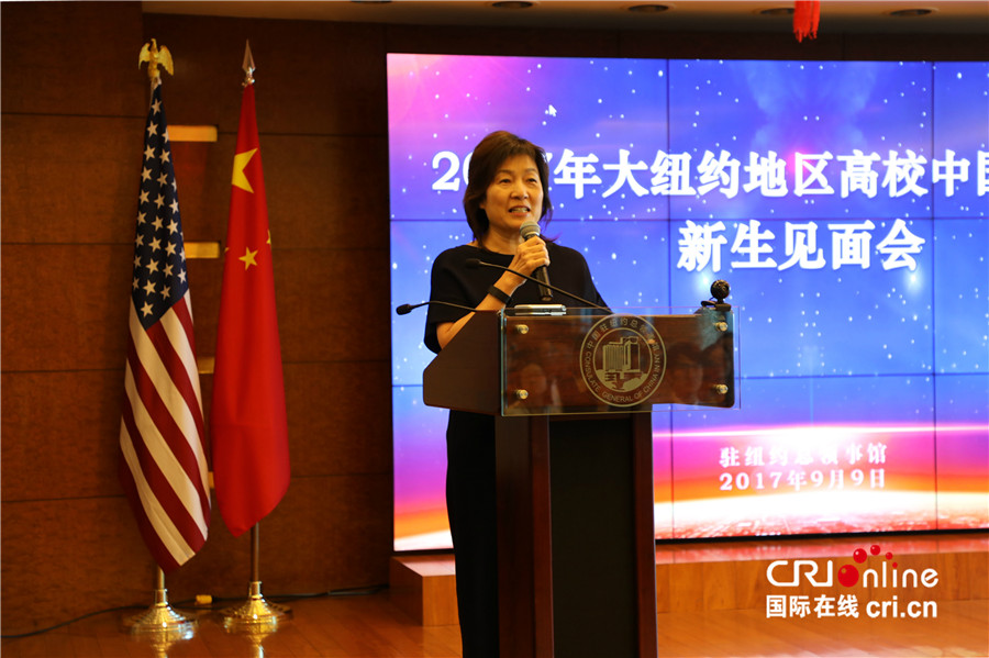 中国驻纽约总领事章启月在2017年大纽约地区高校中国留学生新生见面会上致辞。(摄影:钱珊铭)