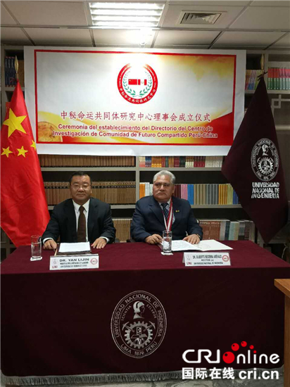 国际在线报道(记者 龚晨):9月18日,中秘命运共同体研究中心在秘鲁利马国立工程大学举行理事会成立仪式。中秘命运共同体研究中心指导理事会中方联席理事长、中国人民大学法律与全球化研究中心主任闫立金及秘鲁国立工程大学副校长阿雷瓦罗出席仪式并致辞。
