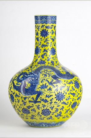 这个花瓶高60厘米,黄底青花,上面绘有3只青龙。拍卖公司Geneve-Encheres的目录上称,这个花瓶是20世纪的作品。但值得注意的是,花瓶上有印章表明这是乾隆时代的作品,但尚未得到确认。