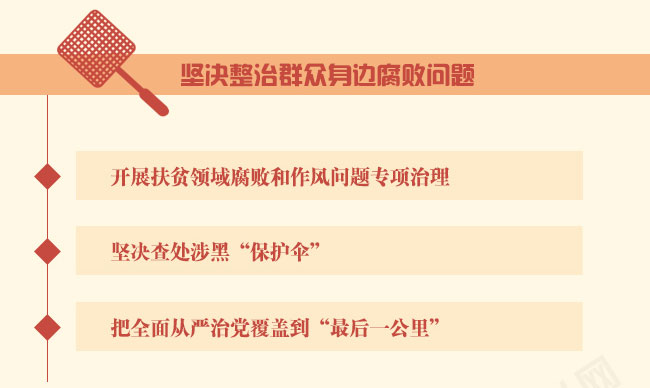 第七,坚决整治群众身边腐败问题。围绕打赢脱贫攻坚战,开展扶贫领域腐败和作风问题专项治理。把惩治基层腐败同扫黑除恶结合起来,坚决查处涉黑“保护伞”。紧盯群众反映的突出问题,加大集中整治和督查督办力度,把全面从严治党覆盖到“最后一公里”。