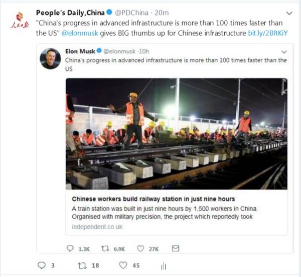马斯克转发的龙岩站施工视频,曾在中国视频网站和社交媒体热传。人民日报海外社交媒体团队为这段视频配发英文字幕,并于1月22日通过人民日报优兔、脸谱、推特官方账号发布,迄今视频播放总时长超过300小时,观看量150多万,引发外国网民对“中国速度”的惊叹和赞扬。