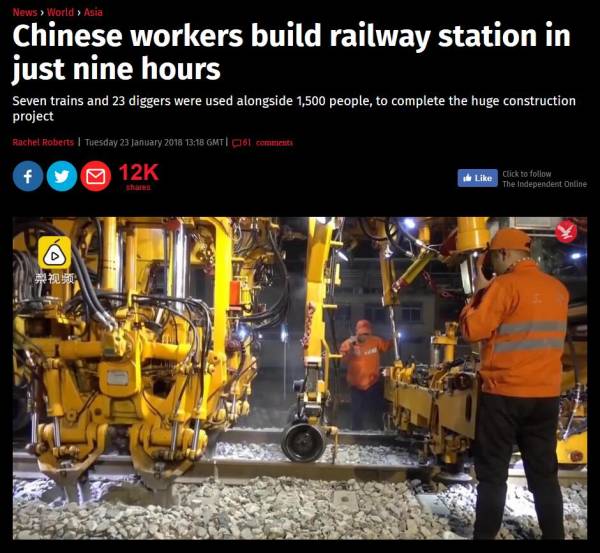报道以《中国工人建火车站只要9个小时》为标题,并称中国的先进基建工程让人“叹为观止”。