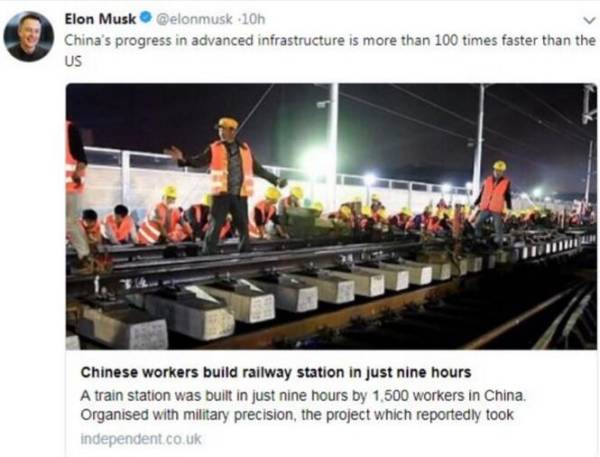 央广网北京2月28日消息 近年来,中国速度日益引发外媒关注。今天(28日),一段中国工人在火车站施工的视频又走红美国,刚刚将跑车送上太空的企业家马斯克(Elon Musk)也忍不住转发赞叹,“中国先进基础设施发展速度比美国快了100多倍”。