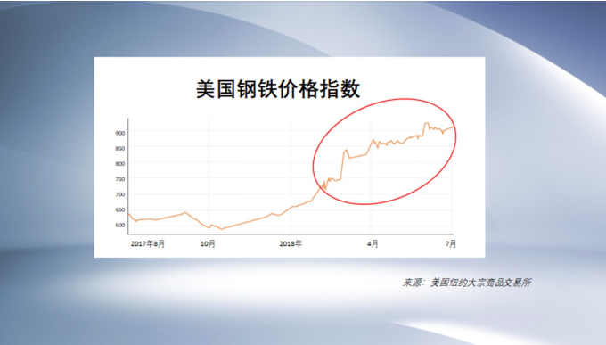 今年初,美国宣布将对产自中国的钢铁加征25%关税后,纽约大宗商品交易所的钢铁价格一路飙升,截止到7月3日已突破900美元/吨,年内涨幅40%,创下了十年以来的最高点。目前,美国的钢铁价格比欧洲和中国贵50%。
