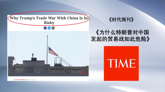 《时代周刊》的标题是《为什么特朗普对中国发起的贸易战如此危险》,文章指出中国出口到美国的商品包含了来自全球各地区的零部件和半成品,在全球产业链互相依存程度很高的今天,白宫看似打击中国,其实损害了全球贸易。
