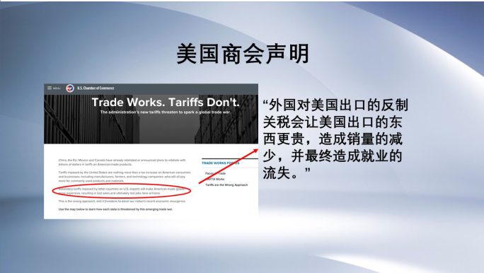 而美国商会在最新一份报告中说“外国对美国出口的反制关税会让美国出口的东西更贵,造成销量的减少,最终可能造成就业的流失。”