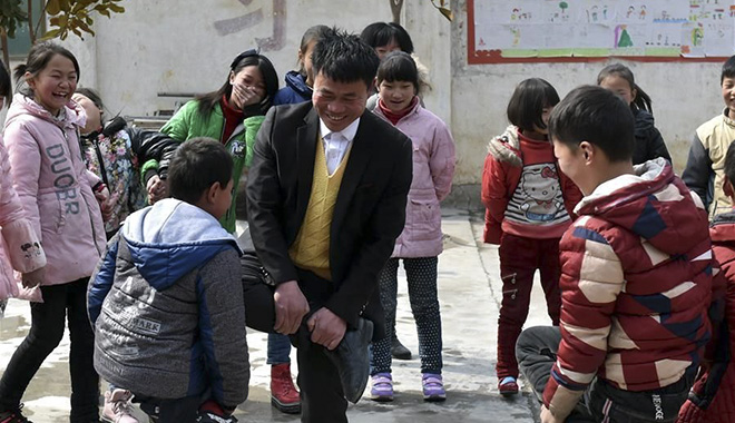 数学课上,张玉滚运用直观教学法,和孩子们一起制作钟表表盘、正方体、长方体等教具;科学课上,他带领孩子们去野外考察,自己动手做实验,激发他们热爱大自然、探究大自然的兴趣。学校缺少体育设施,大课间时,他就和孩子们围成一圈玩抵羊斗鸡,活动课还经常领孩子们去爬山。