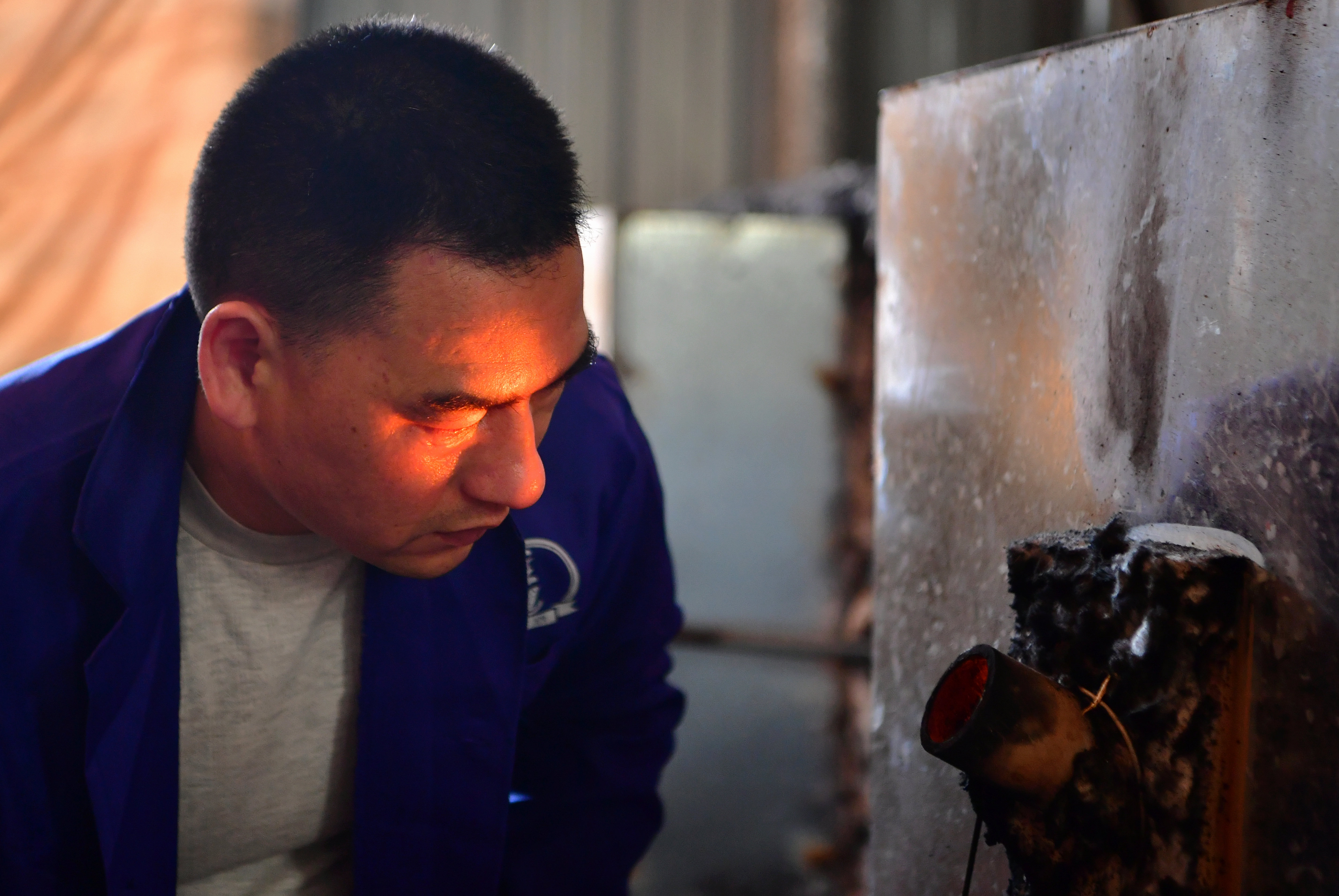 ↑3月28日,廖设生在使用电炉加柴火烧制的方法烧制曜变建盏。 新华社记者魏培全摄
