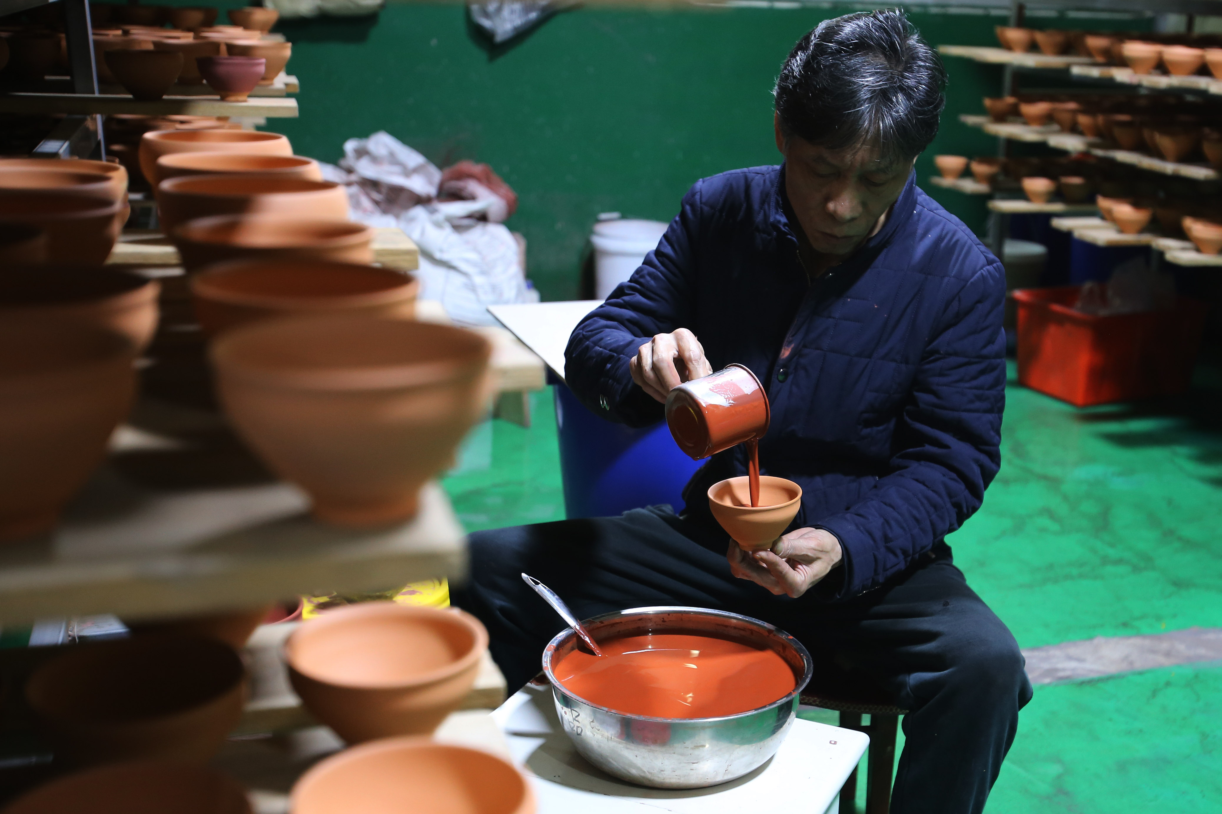 ↑3月28日,吴立主在准备为建盏坯上釉。 新华社记者安希雅摄