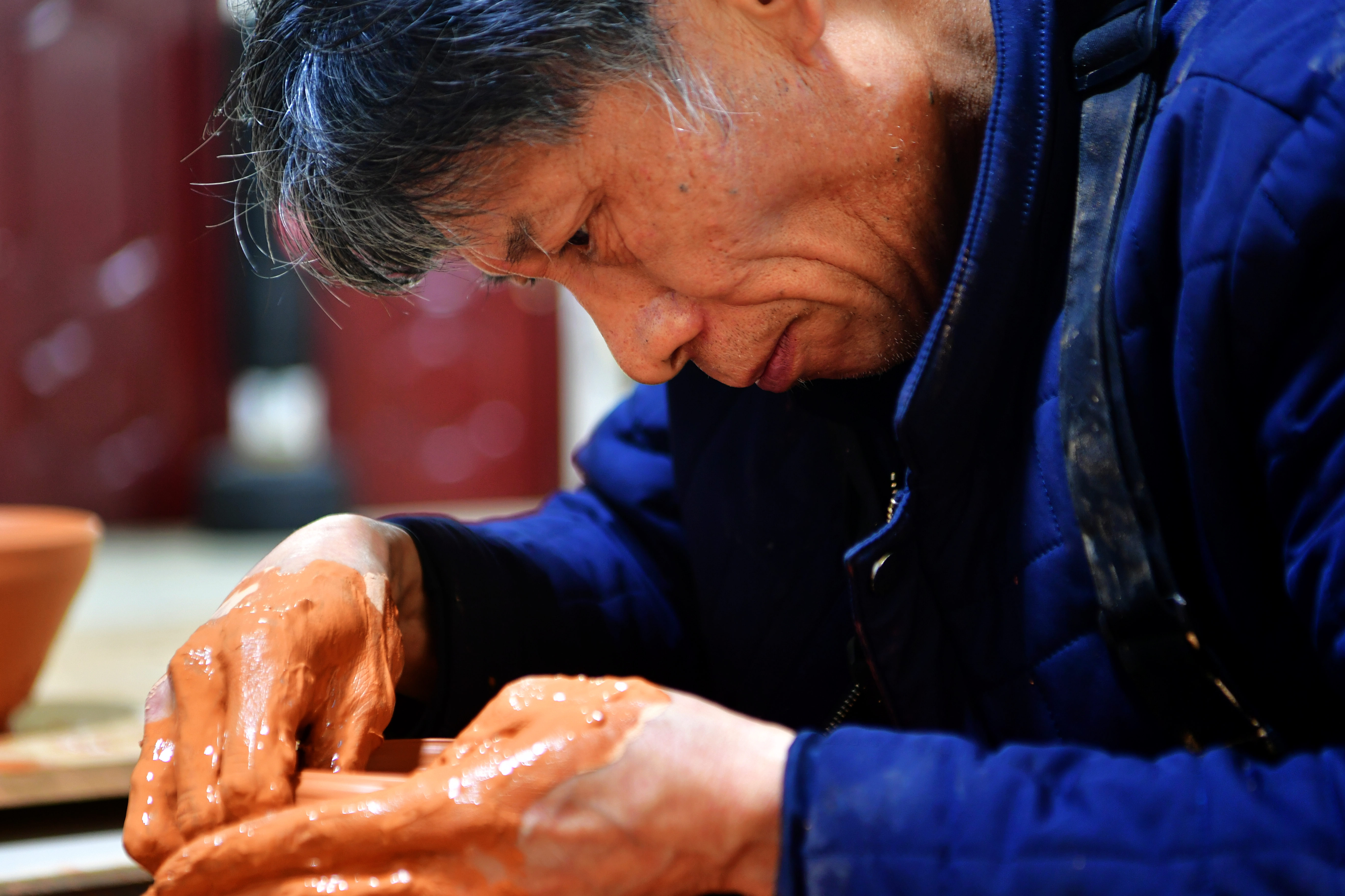 ↑3月28日,吴立主(右)在手拉坯。新华社发(耿馨宁摄)