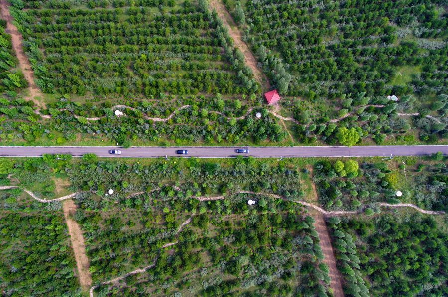 山西省右玉县小南山森林公园一景(2018年8月7日无人机拍摄)。新华社记者 曹阳 摄
