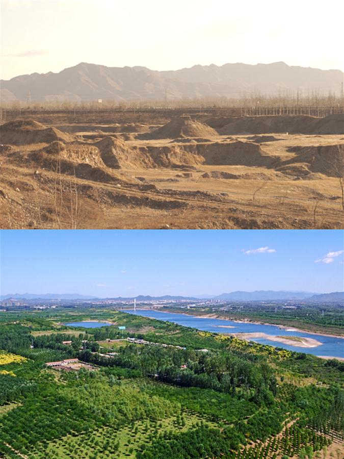 上图为治理前的北京怀柔潮白河流域(2012年摄);下图为治理后的北京怀柔潮白河流域(2018年摄)。 新华社发