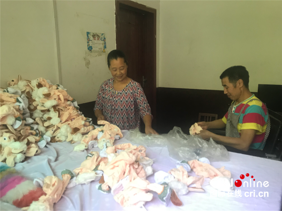 刘堂春和丈夫在家中加工毛绒玩具。摄影:聂峥
