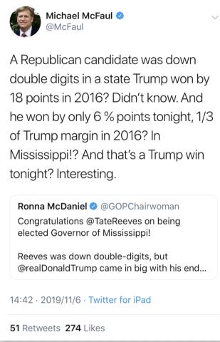 斯坦福大学政治学教授McFaul在推特上表示:“相比2016年特朗普18个百分点的获胜优势,共和党候选人的州支持率下降了两位数。今晚他以6%的优势获胜,仅是2016年特朗普优势的三分之一。在密西西比!? 这就是今晚特朗普的胜利?有趣。”