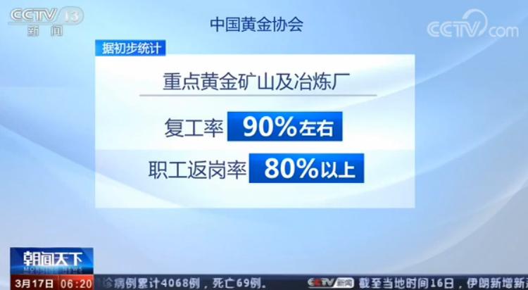 除了零售环节复工正在不断加快外,记者从中国黄金协会了解到,截至3月9日,11家重点黄金企业反馈3月份第1周合计生产矿产金2.36吨,计划完成率为100.09%;9家重点黄金企业反馈3月份第1周合计生产冶炼金4.07吨,计划完成率为116.01%。据初步统计,重点黄金矿山及冶炼厂复工率达到90%左右,职工返岗率达80%以上。