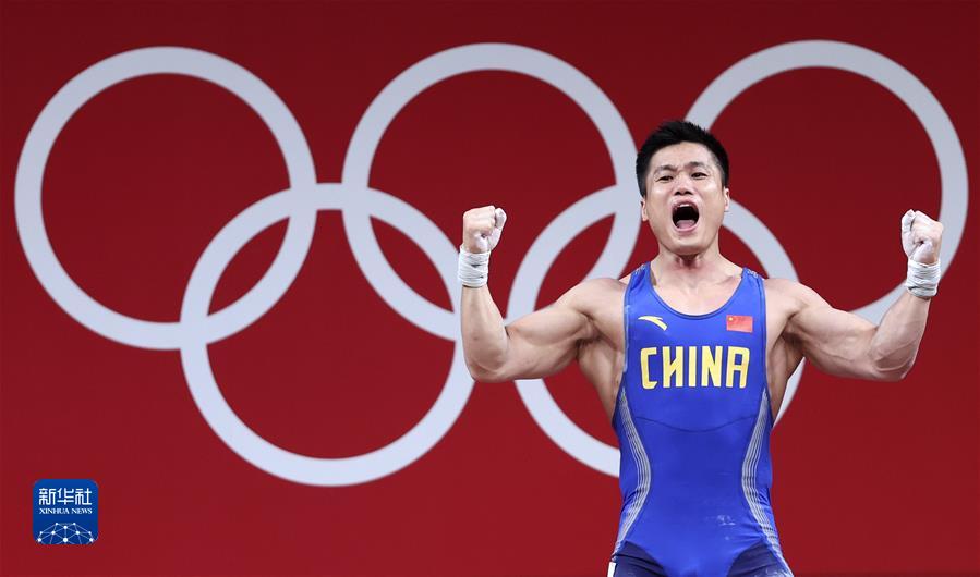 2021年7月31日,吕小军在东京奥运会举重男子81公斤级决赛夺冠后庆祝。新华社记者 杨磊 摄