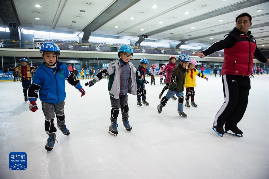 2017年3月7日,小学生在南京奥体中心冰场进行校本课程学习。新华社记者 李响 摄