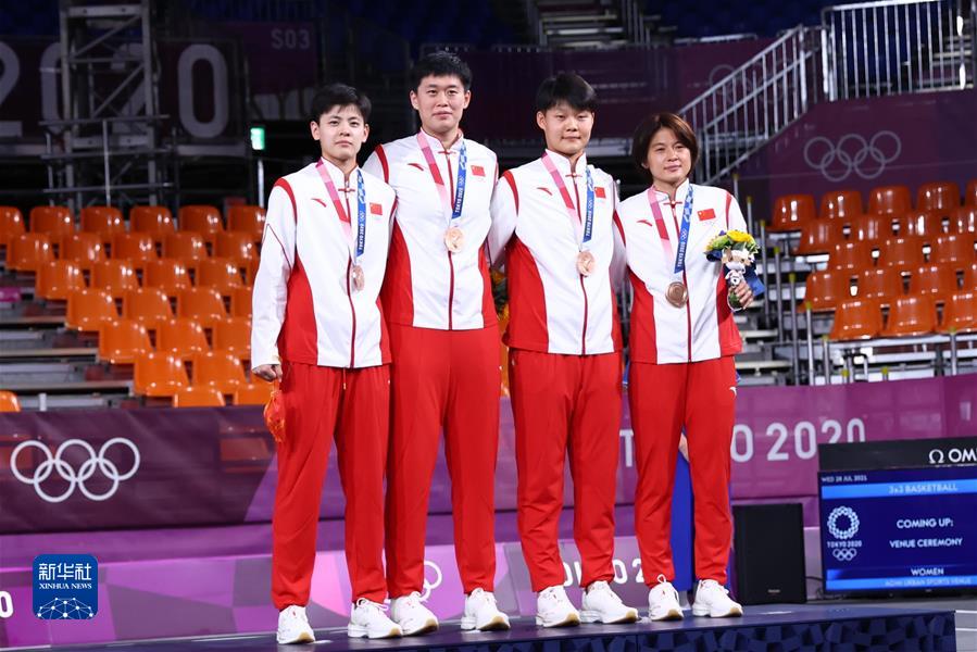 2021年7月28日,季军中国队队员在东京奥运会三人篮球女子组颁奖仪式上合影。新华社记者 兰红光 摄