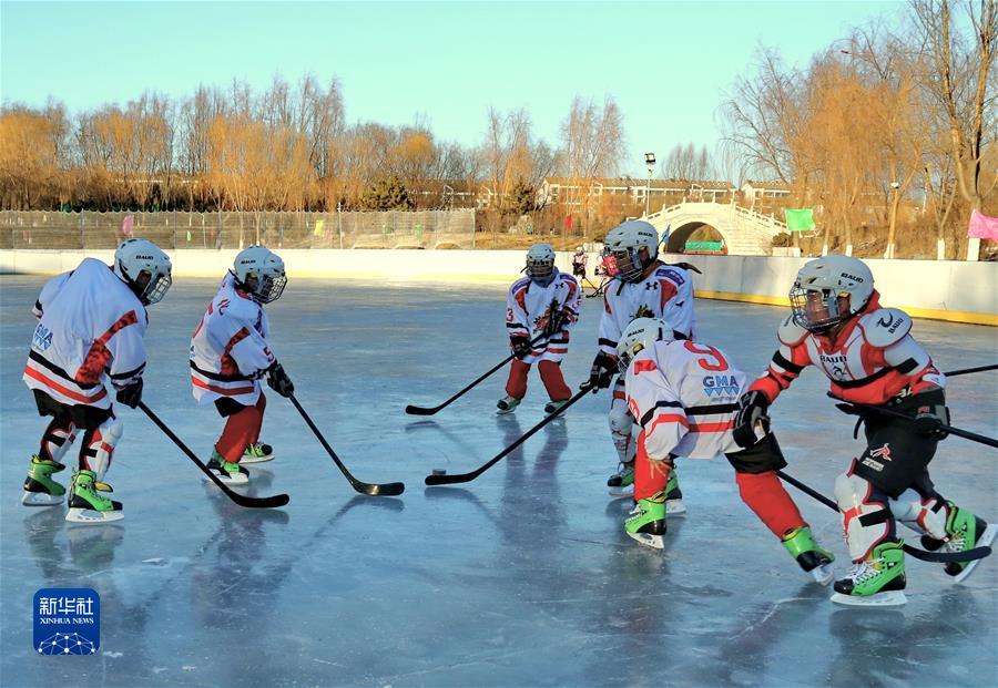 2017年1月22日,张家口市宣化区少儿体校冰球队在进行集训。新华社发(武殿森 摄)