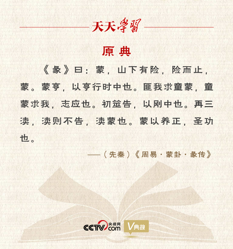 “蒙以养正,圣功也”出自《周易》蒙卦的彖辞。儿童出生后知识未开,对世界还懵懵懂懂,所以叫作“蒙童”。培养蒙童使之接受教育走上正道,成为对社会有用的人,这是圣人最伟大的功业。
