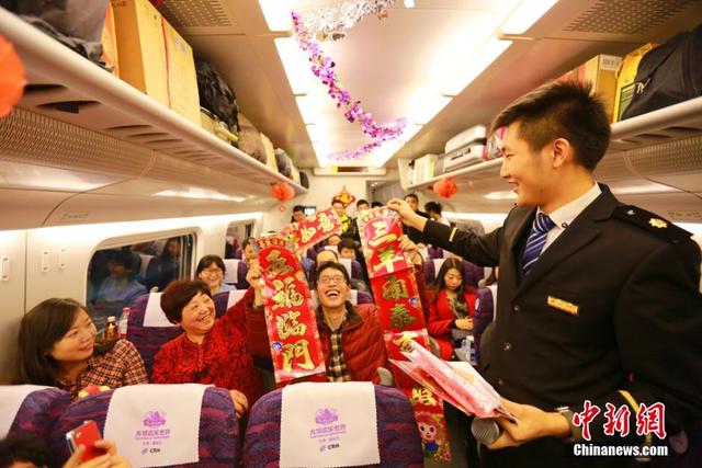 2月17日,由兰州开往乌鲁木齐的D2703次动车组列车上,一场由高铁乘务员自编自演的新年“文化大餐”正在上演。此次春节是兰新高铁开通运营后的首个春节,也是甘、青、新三省区各族人民首次乘坐高铁回家过年。为了增添三省区旅客首乘高铁过年的喜庆气氛,兰州客运段挑选了20多名高铁乘务员,精心编排了独唱、舞蹈、旅客互动猜谜等新年文化节目,为乘坐高铁回家过年的旅客奉上一份新年文化“大餐”。丁顗 摄