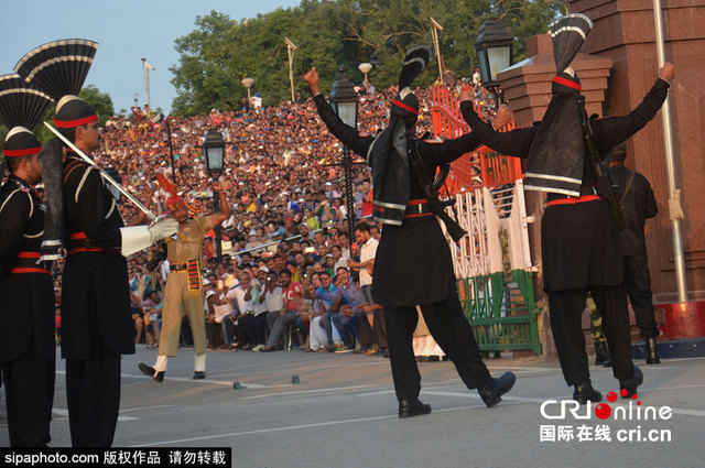 当地时间2015年7月26日,拉合尔城印巴边界地区,印度和巴基斯坦举行著名的降旗换防仪式,吸引众多当地群众围观,趣味性十足。图片来源:Sipa Photo