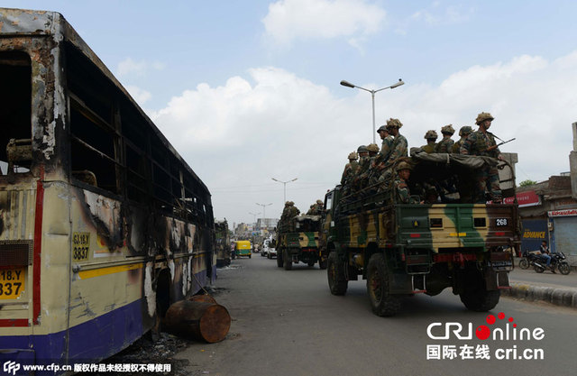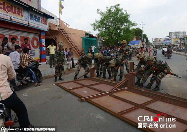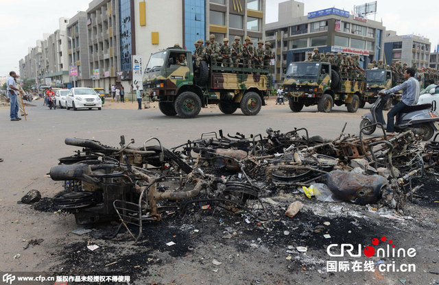 当地时间2015年8月27日,印度艾哈迈达巴德,印度军队加强街头巡逻。8月25日晚,一些暴徒在古吉拉特邦阻断火车、破坏铁轨、袭击警察并烧毁政府和平民的车辆,之后印度当局宣布古吉拉特邦的五个城市实行宵禁。图片来源:CFP