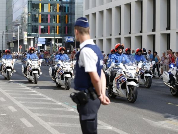 7月21日,在比利时首都布鲁塞尔,警察队伍参加阅兵。当日,在严格安保措施下,比利时在布鲁塞尔市中心举行国庆阅兵式。(新华社记者叶平凡摄)