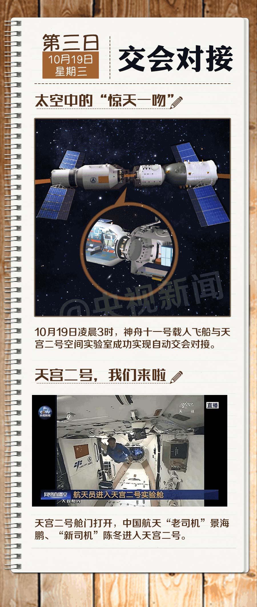 10月17日7时30分,神舟十一号载人飞船发射升空,宇航员航天员景海鹏、陈冬踏上前往太空的征程。19日早上6点24分,神舟十一号飞船上的航天员景海鹏打开天宫二号的舱门,二人顺利进入天宫二号,正式开启在空间实验室的30天生活。