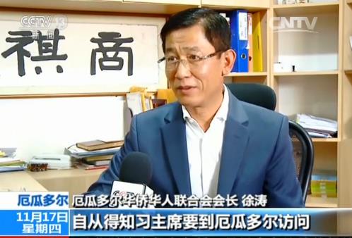 厄瓜多尔华侨华人联合会会长徐涛:自从得知习主席要到厄瓜多尔访问,厄瓜多尔华侨华人心情非常激动。中厄建交36年以来,中国元首第一次访问厄瓜多尔,当地华侨感到特别自豪,感到在这里的地位一下子提升了很多。习主席来访肯定是一个新的里程碑,在经济、贸易、文化各个领域,肯定有一些新的合作项目。我们华侨华人也期待着这一天,能成为祖国和厄瓜多尔两国之间的桥梁和纽带。