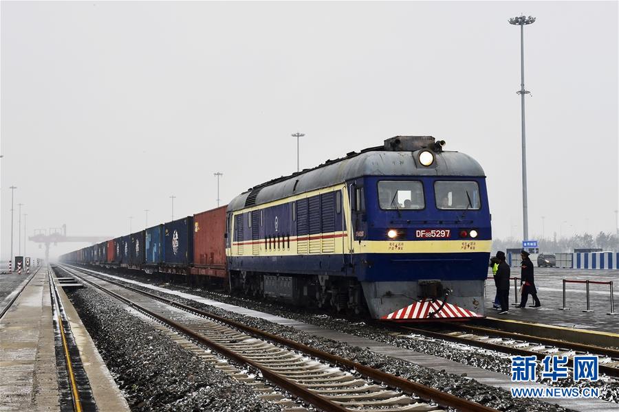11月21日,天津—明斯克中欧班列停在天津自贸区东疆片区海铁中心站内,准备发车。当日,一列满载货物的集装箱班列从天津自贸区东疆片区海铁中心站发车开往白俄罗斯明斯克,这是天津自贸区首条直通欧洲的货运班列。中欧班列开通运营充分发挥东疆保税港区丝绸之路陆上和海上连接点的优势,将21世纪海上丝绸之路经济带综合资源平台与天津自贸区功能创新平台连接起来。新华社发(薛力强 摄)