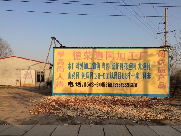小泊头镇的街道旁,一家网具加工厂做了整面墙的广告。