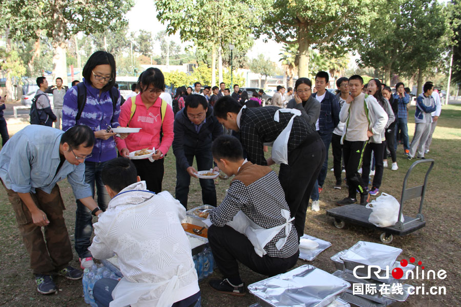 25日中午,使馆临时代办蔡蔚鸣专门从使馆带来了中餐炒菜和米饭,安排同学们到酒店附近的公园草地上就餐,同学们热烈鼓掌表示感谢。