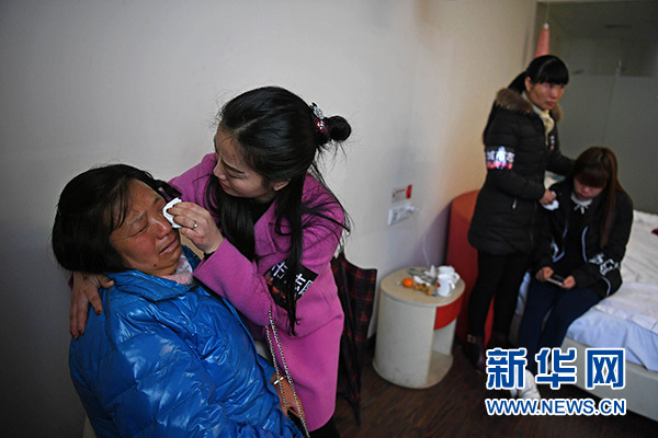 11月26日,心理疏导志愿者在事故现场附近的宾馆抚慰来自湖北的遇难者家属。新华社记者 万象 摄