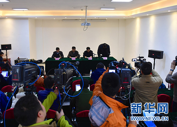 11月26日,在新闻发布会现场,涉事单位河北亿能烟塔工程有限公司董事长张运平(右一)鞠躬致哀。新华社记者 胡晨欢 摄