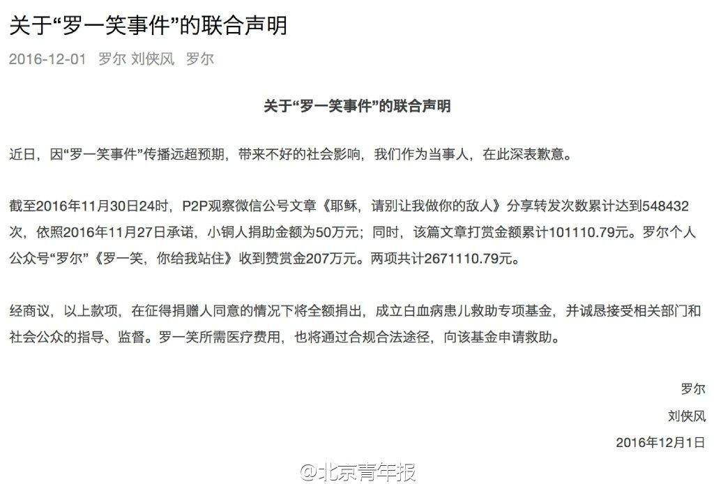 声明透露,截至11月30日24时,P2P观察公号文章《耶稣,请别让我做你的敌人》分享转发次数累计达到548432次,依照2016年11月27日承诺,小铜人捐助金额为50万元;同时该篇文章打赏金额累计101110.79元。罗尔个人公众号《罗一笑,你给我站住》收到赞赏金207万元。两项共计2671110.79元。经商议,“以上款项,在征得捐赠人同意的情况下将全额捐出,成立白血病患儿救助专项基金”。而罗一笑所需医疗费用,也将通过合规合法途径,向该基金申请救助。