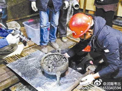 12月13日,在河南一座古墓发掘现场,出土了几只装有“牛肉汤”的鼎,据动物考古专家鉴定,鼎里“煮”的是牛前肢。15日,北京青年报记者联系了该河南墓葬发掘的项目负责人武志江,武志江对北青报记者称,该墓葬为战国时期楚墓,鼎内“肉汤”为地下渗水。