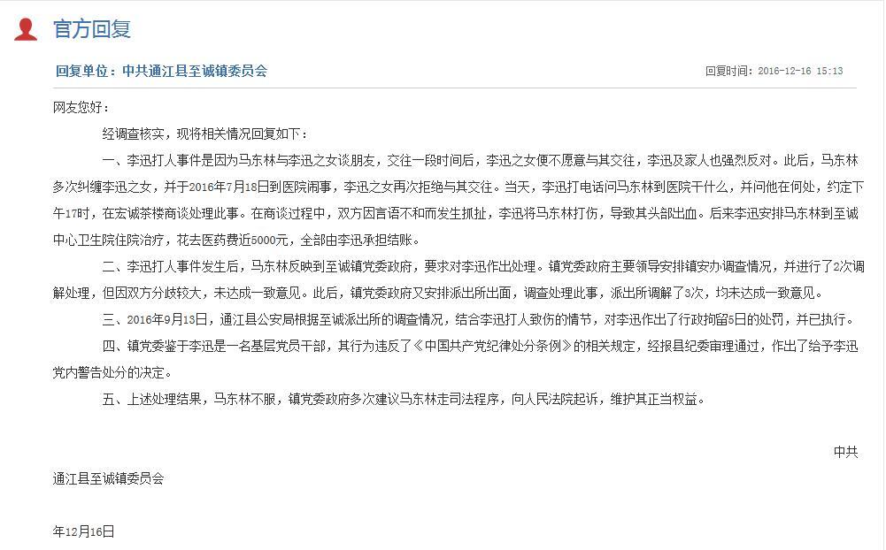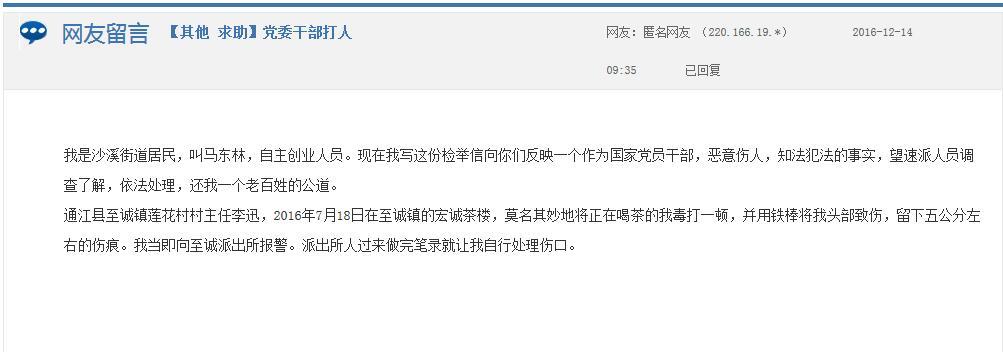 四川在线消息(记者 杨琴) “通江县至诚镇莲花村村主任李某,2016年7月18日在至诚镇的宏诚茶楼,莫名其妙地将正在喝茶的我毒打一顿……”12月14日,网友马某某在“问政四川”平台留言,称自己被巴中市通江县至诚镇莲花村村主任李某打伤。对此,通江县至诚镇党委于12月16日作出了回复。