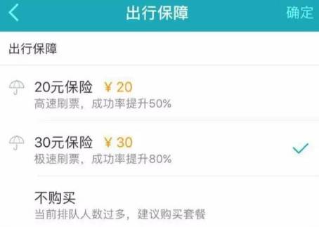 在一款订票软件上,在预约抢票时,出行保障一栏自动勾选了30元的保险,选项下面一行小字写着“极速刷票,成功率提高80%”,还有20元的“高速刷票,成功率提升50%”;不购买的选项下注明“当前排队人数过多,建议购买套餐”。此外,如果有购票备选方案,选择20个车次,需另支付227.5元。 就这样,火车票还未抢到手,除票价外又多支付了200多元。