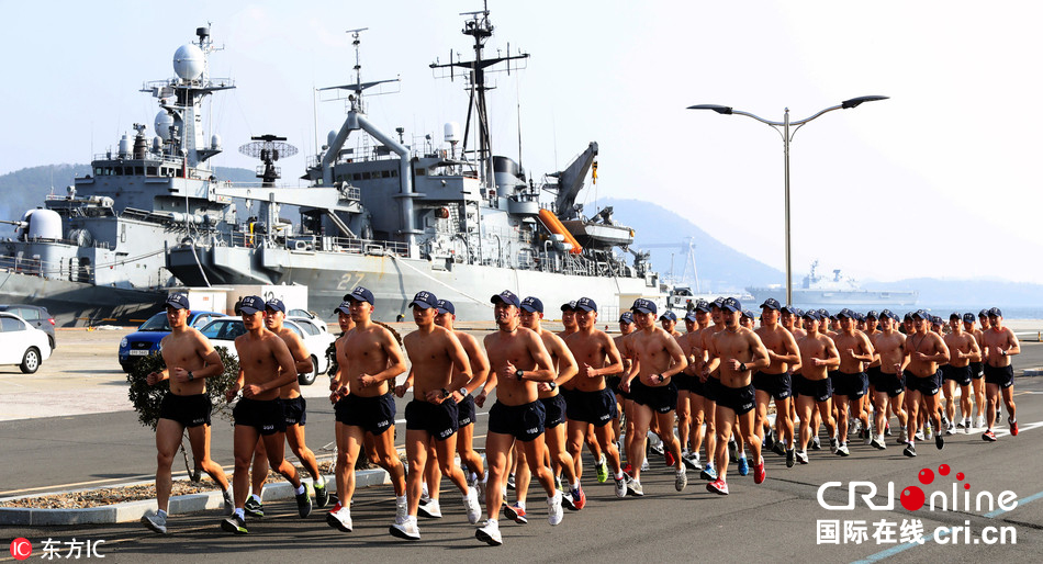 当地时间2017年1月9日,韩国昌原市,韩国海军海难救助队(SSU)在庆南镇海军港开始酷寒期海难救援训练。酷寒期训练包括赤身跑步、游泳等等。图片来源:东方IC