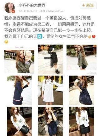 从女方ID名称为“小齐齐的大世界”的微博中可以看出,女方常晒出自己的生活照和个人心情。有趣的是,就在16年10月,她还曾发文说自己永远不能成为第三者,要成为一个善良的人。