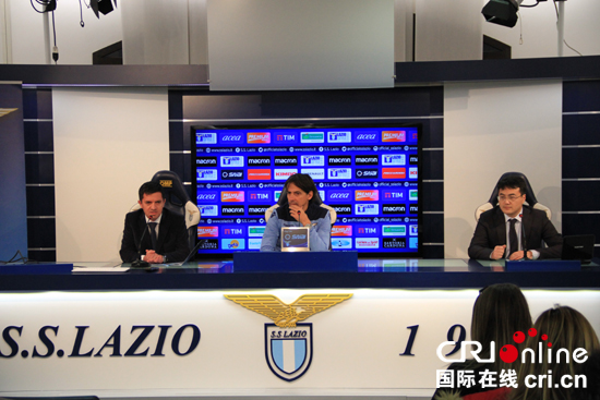 1月17日,拉齐奥主教练西蒙尼·因扎吉(中),拉齐奥市场部经理卡尼亚尼(左),驻意使馆新闻处主任张爱山(右)在发布会上