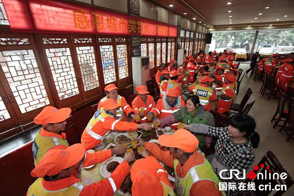 国际在线四川频道报道(记者 刘江):新年临近,为了表达对环卫工人辛勤工作的敬意,近日,成都成华区万年场街道的三家餐饮企业联合邀请200位环卫工人吃暖心大餐。